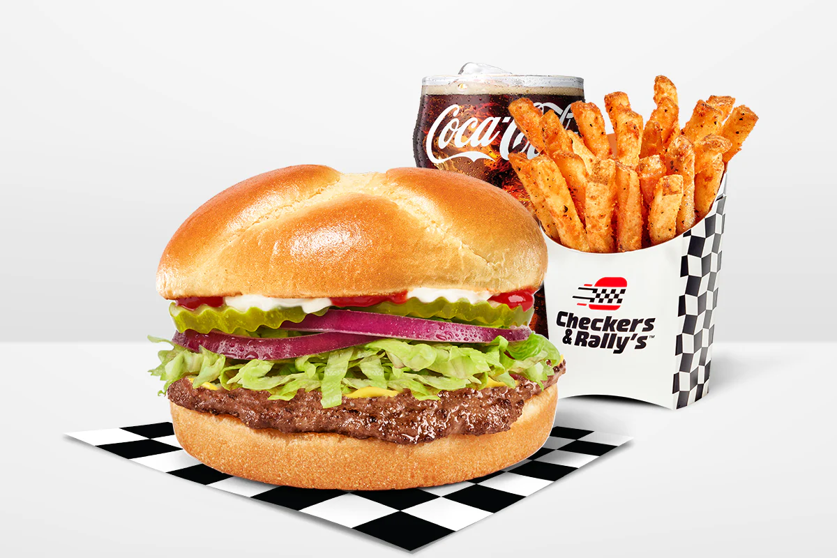 A classic for a reason! Checkers’ & Rally’s Classic Burger is made with our 100% beef hamburger patty topped with crisp iceberg lettuce, two crinkle-cut pickles, two slices of red onion, ketchup, mustard and mayonnaise and served on a toasted, bun.